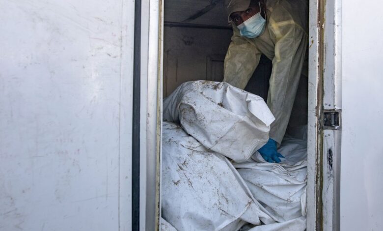 يعرض الطبيب صورًا، الجثث ملقاة على الأكياس الزرقاء التي نُقلت فيها إلى غزة، يصعب التعرف عليها بسبب إصاباتها وتحللها.